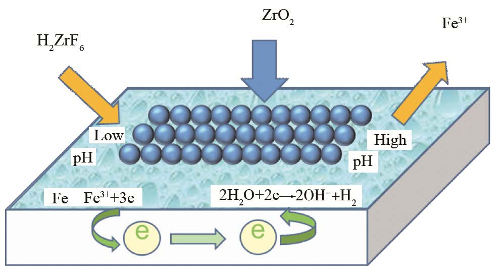 經(jīng)上述反應(yīng)后,金屬基材表面會(huì)形成一種“ZrO2-Fe-ZrO2”結(jié)構(gòu)的溶膠。隨著反應(yīng)的進(jìn)行,溶膠的交聯(lián)密度逐漸增大,不斷凝聚沉積,最終形成連續(xù)致密的ZrO2膜層。鋼鐵表面鋯鹽轉(zhuǎn)化成膜過(guò)程原理如下圖: